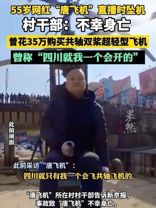 网红唐飞机驾驶超轻型飞机直播时坠机