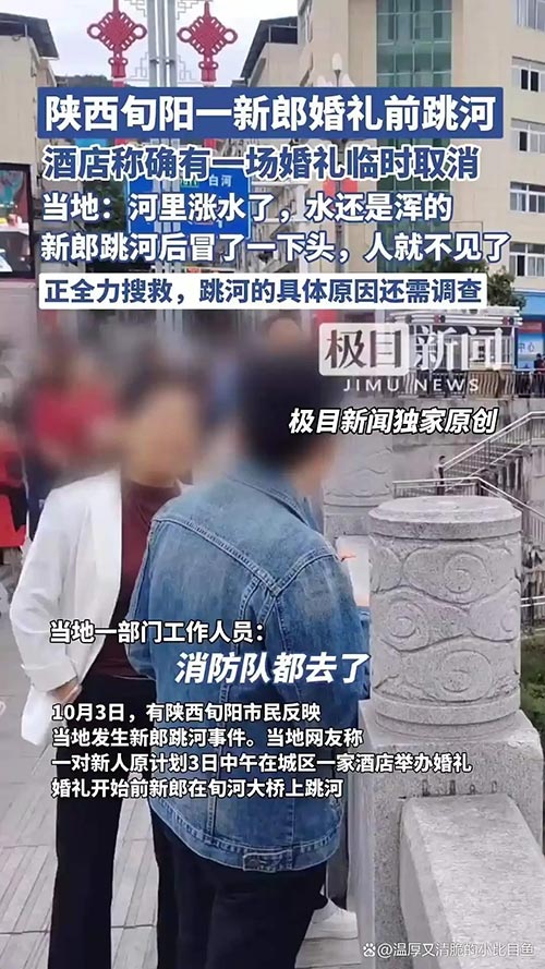 10月3号,网传消息爆料,陕西旬阳一新郎官竟然在婚礼前跳河自杀,一条人命,给出了最血淋淋的答案!