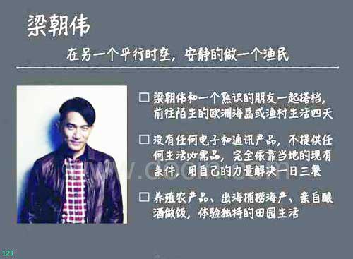 导演组会设定明星在一间可以实现时空旅行的酒吧,选择自己想要的时间旅行方式。到另外一个时空后,明星需在体验的过程中完成任务。据剧透,梁朝伟在节目中将选择平行时空,到另一空间做一个安静的美男子渔民。节目中,梁朝伟将和一个熟识的朋友一起搭档,前往陌生的欧洲海岛或渔村生活。在没有任何电子和通讯产品信不提供任何生活必需品的情况下,梁朝伟完全依靠当地现有的条件,出海捞渔呀,做饭吧,体验一番独特滋味的田园生活!