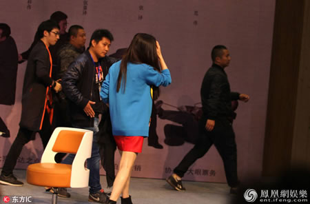 10月24日,冯小刚导演最新电影《我不是潘金莲》在华中师范大学举行提前观影暨“喜剧的挑战”幽默研讨会。范冰冰现身仅10分钟后,主持人突然宣布:“因为有些小小的突发情况,冰冰姐需要稍事休息下。”一旁的冯小刚则打断了主持人称:“这件事真不是我们主创可以控制的。现在是要求范冰冰马上离场,如果不离场马上断电。”