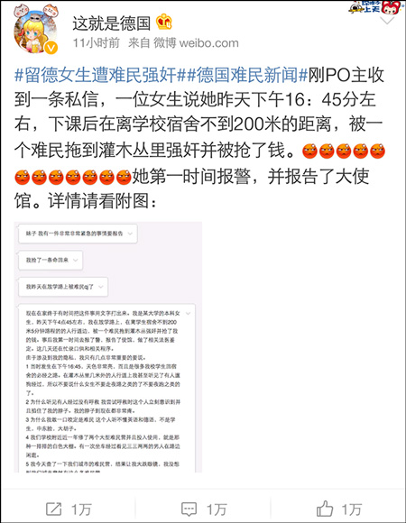 11月18日,微博海外资讯博主@这就是德国发文称,一名中国留德女生遭难民强暴并被抢钱,引发关注。受害女生称已第一时间报警及报告使馆,并做了法医鉴定。