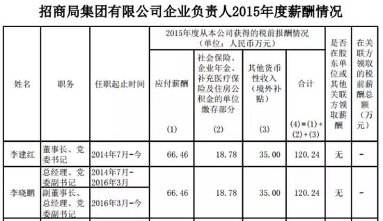 其中,招商局集团有限公司董事长、党委书记李建红和总经理、党委副书记李晓鹏,均为120.24万元的税前薪酬,是2015年度央企负责人税前薪酬收入最高的2位。