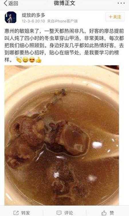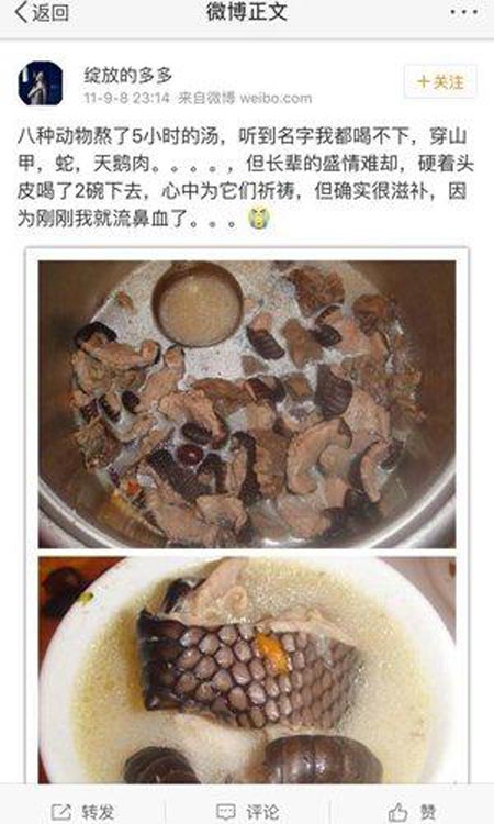 被曝光的网友微博名为“绽放的多多”。2011年9月8日,该网友发布微博称,其喝了“穿山甲、蛇、天鹅肉”等八种动物熬制成的汤,并吃了“穿山甲血炒饭”,微博配图显示,一个小锅中有近30块疑似穿山甲肉块。2012年3月6日,该网友再次发布微博称,“好客的廖总提前叫人炖了四个小时的冬虫夏草穿山甲汤,非常美味。”