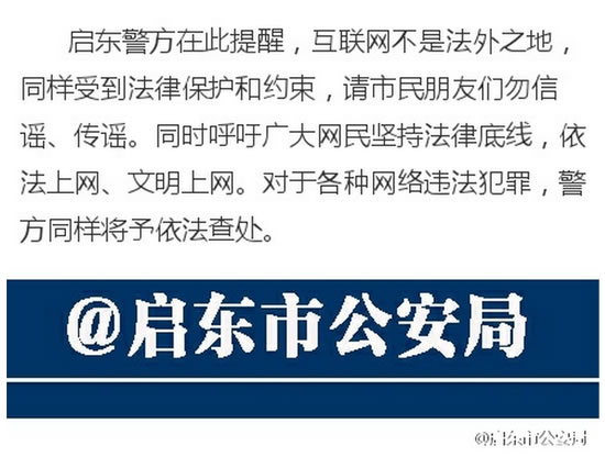网友在微博下留言,“支持公安机关,对那些借机煽动搞破坏,还有造谣的,依法惩处,维护社会秩序!”“爱国需理性!但爱国不会被污名!对造谣传谣坚决予以打击!”,更有网友为警方点赞,“赞启东警方,不能都这么愚蠢”。