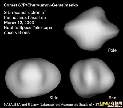 科学家还发现格拉希门克彗星在纵向上显得瘦小,有些像被拉长的小天体,事实上该“罗塞塔”号探测器已经调查过五个彗星核,它们都不是球形,似乎此类天体的内核都是不规则的形状。对此,来自“罗塞塔”号探测器分系统的科学家认为不规则的外形使得着陆计划将面临严峻的挑战。“罗塞塔”项目来自欧洲空间局,美国宇航局也参与了该项目,“罗塞塔”携带了一个被称为“莱菲”的着陆器,由德国航空航天中心负责,按照计划,“莱菲”着陆器将登陆格拉希门克彗星。