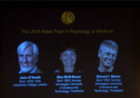 #财新时讯# 【2014年诺贝尔生理学或医学奖揭晓 英挪科学家共享殊荣】10月6日17时30分左右,瑞典卡罗琳医学院在斯德哥尔摩宣布,将2014年诺贝尔生理学或医学奖授予英国科学家约翰·奥奇夫、和挪威科学家梅-布里特·莫泽和爱德华·莫泽夫妇,以表彰他们发现构成大脑定位系统的细胞的重大贡献。