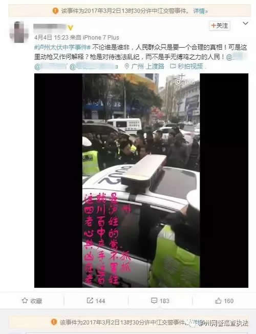 此视频为2017年3月2日13时30分许,中江公安交警大队在县城伍城路建设银行红绿灯路口开展道路交通整治发生的事件,并非泸州太伏处置现场视频。对此,@中江公安于3月3日对此事进行了通报。
