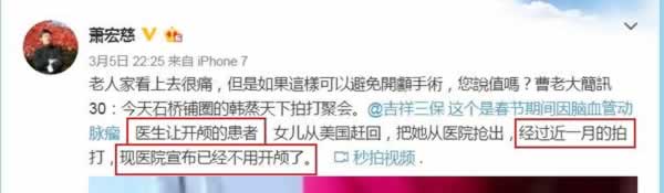 3月5日,“神医”更是堂而皇之在新浪微博发文,声称一个脑动脉瘤患者,被其拍打一个月后治好了。