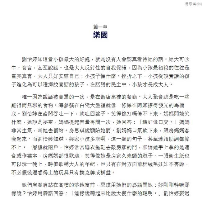 《房思琪的初恋乐园》是一份具有独特性的珍贵书写,全书共分为三章:第1章 乐园;第2章 失乐园;第3章 复乐园。以下为小说《第1章乐园》全文欣赏。摘要如下:……已婚补教名师李国华五十岁了,诱姦十三岁的房思琪之前,狩猎学生的经验已很老到。在初次性侵五年后,与思琪情同双胞的刘怡婷,接到警局通知,去带回神智不清,被判定疯了的思琪。透过思琪的日记,怡婷得知思琪五年中的所见所思。