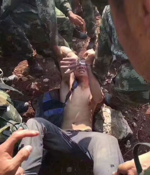 8天后的5月10日早上,网上出现几张照片,一名光着身子的男子,被荷枪实弹的武警抓获,图片被配以“嵩明小街派出所辖区接群众举报,说看见一个长像类似张林苍的人在附近出没,随后嵩明公安局出动发现踪迹,武警特警再出动,围捕过程中,逃犯一路沿药灵山方向跑,据说出动了武警,特警,特勤,无人机”。