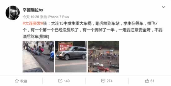 今晚19时25分,网友@辛德瑞拉bx微博爆料,大连15中发生重大车祸,一辆路虎撞到正在候车的学生,撞飞7人,目前伤亡情况还不清楚。目前,辽宁日报报业集团下的半岛晨报官方微博转发了这一交通事故并评论:“太惨烈了。”