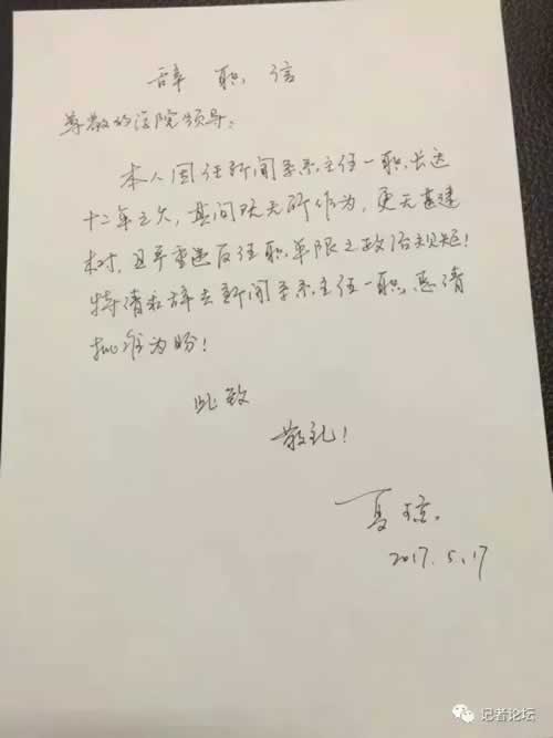 本人因任新闻系系主任一职长达十二年之久,期间既无所作为,更无甚建树,且严重违反任职年限之政治规矩!特请求辞去新闻系系主任一职,恳请批准为盼!