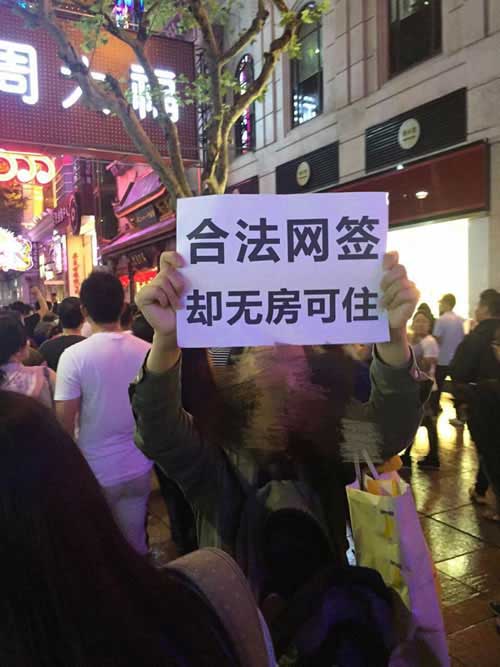 网曝上海南京路商住房维权视频现场人声鼎沸,网友称上海南京路今夜无眠,上演人民的名义!上海南京路昨晚上演商住用户维权,疑因网签商住房限制居住引发的群众抗议事件,现场中有群众高举“合法网签 却无房可住”的纸张。
