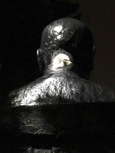 警方表示,涉嫌毁损公物的男子分别是66岁的郭姓男子、22岁的林姓,两人伸缩楼梯跨在蒋介石铜像的背部,攀爬上比人还高的脖子部位,喷出高温氢氧焰,企图以火焰切割铜像头部,警方获报后,立即将两人逮捕,并在现场发现两只钢瓶、阶梯、手套,两人均坦承犯行。