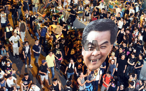 11月2日,“佔领中环”非法集会的第36天,戾气笼罩著被违法示威者佔据的地方。偷电、粗口、肢体衝突,每天都在上演。“佔中”发起人原先標榜的“爱与和平”,其虚偽毕露。图为非法集会者手举侮辱官员的照片游街。香港中通社图片