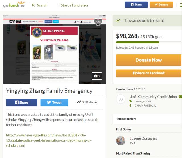 伊利诺伊大学警方在其官方网站上发布消息称,该校社区信用联合会设立了一个账户,并发起了GoFundMe活动,以支付章莹颖家属在学校停留期间的生活费用。