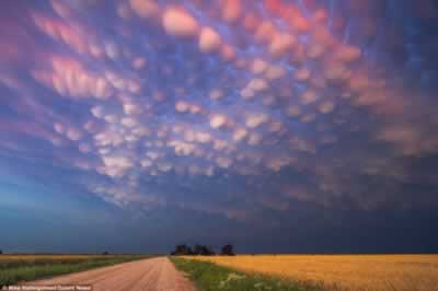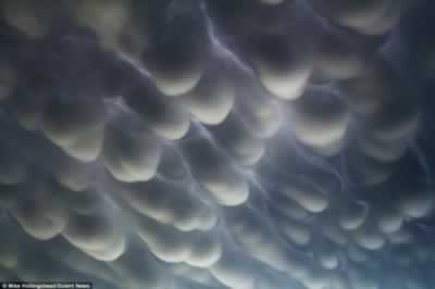 11月20日报道,一位来自美国内布拉斯加州的风暴追逐者Mike Hollingshead拍摄了一组令人难以置信的天空中“云泡沫”的照片。据了解,这些云彩被称为是“乳房云”,是雷暴天气过后才能出现的罕见的云彩状态。