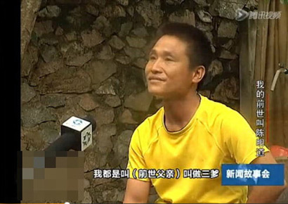 “我一进门,便见到了三爹。只见三爹苍老了很多,这时我走到三爹面前用儋州话叫他一声三爹。三爹大惑不解。我再向他解释说,我是你的儿子陈明道,那年被人打死,后托生到东方感诚不磨村,现来找您。我的这些话,使三爹惊得目瞪口呆,一时反应不过来。我知道我这么小年纪,说话大人不相信,我便跑进房间,把我死后他们给我立的神牌抱出采,对他说这是我的神牌,现在我是活人,不要放在上面了。并且告诉他,我以前睡哪个房哪张床,并一一数出我以前常用过的东西。三爹见我说得一丝不差,确认了我是陈明道后,他一下子抱起我大哭不止,我也抱着他哭,跟着我一起来的唐崇进父亲也哭。这时,惊动了四邻,他们都赶来看是怎么一回事。不久,人越来越多,我们三人只是哭着,他们不知道是怎么回事。后来还是东方那边的父亲把事情经过向他们说了。他们听着听着,也伤感哭泣不止。“一场伤感过后,三爹把我放下。我这时才见到很多人。这些人中有亲人二爹的儿子陈军助弟弟(我在前生比他大),还有以前的好友,每一个人我都认得,并且上前叫他们名字,说以前与他们一起做过什么事,说得一点不差,他们不得不承认我是陈明道。