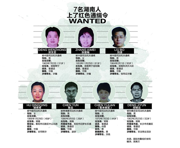 记者从湖南省公安厅经侦总队得知,这7名被通缉的湖南人的姓名分别是:来自湖南常宁的邓文忠、张爱梅,来自株洲的刘波、衡阳的胡青青、岳阳的陈云以及长沙的邓继云。此外,一位名叫CHEN YI JUAN的湖南女子,身份、住址信息暂时不明。