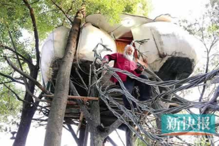 原标题:60多岁老人隐居树上"鸟巢" 建造三室一厅