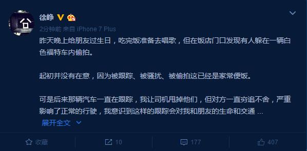 感谢大家的关心,希望大家能理解,虽然我是公众人物,但我和朋友吃饭时,并非是在一个面对公众的环境。遭遇不明来由的刻意跟踪和偷拍,这已经严重侵犯了我的私人空间,这让我心生恐惧,因为我并不能确认对方的身份到底是否真正的记者。所以我也不知道在后续的事态中对方到底要干什么?