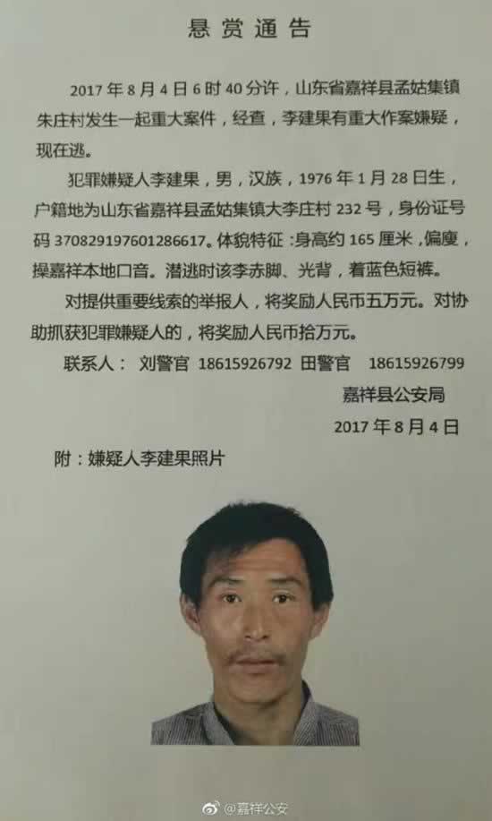 网曝山东嘉祥李建果杀4人外逃 或因婚恋纠纷引发凶杀案