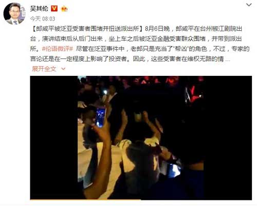 今日,知名财经评论人吴其伦在微博透露,8月6日晚,郎咸平在台州椒江剧院出台,演讲结束后从后门出来,坐上车之后被泛亚金融受害群众围堵,并带到派出所。