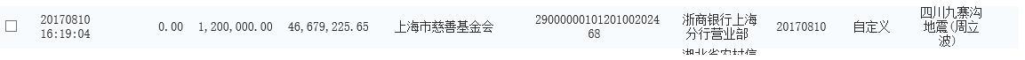 8月10日16时19分04秒,四川省红十字会设在中国建设银行的捐赠帐户收到上海慈善基金会从浙商银行上海分行营业部转来人民币120万元,备注为四川九寨沟捐款(周立波)。