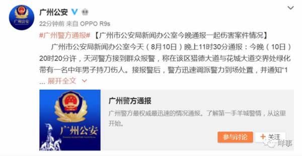 @广州公安8月10日晚消息,广州市公安局新闻办公室8月10日23时30分通报:当日20时20分许,天河警方接到群众报警,称在该区猎德大道与花城大道交界处绿化带有一名中年男子持刀伤人。接报警后,警方迅速调派警力到场处置,并通知“120”派员救治伤员。