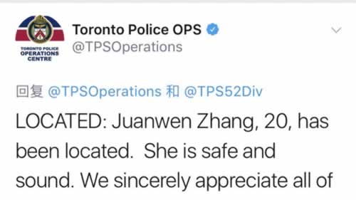 直到当地时间11日晚,多伦多警方披露,章镌文已被找到,同时被找到的还有另一名在多伦多附近汉密尔顿的麦克马斯特大学留学的女生。