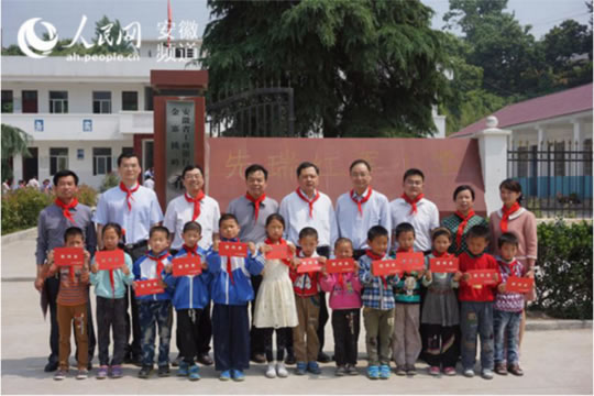 苏明娟(后排右一)参加工商银行安徽省分行定点扶贫学校桃岭希望小学公益活动