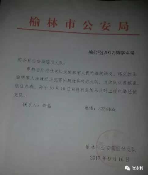 此事也引起陕西省公安厅和陕西省检察院的重视,华商报记者获得的一份榆林市公安局“榆公经【2017】转字4号”文件显示,榆林市公安局经侦支队按照陕西省公安厅和陕西省检察院转交的批示,已经责成府谷县公安局经侦大队调查王治明等人是否涉嫌违法犯罪的情况。