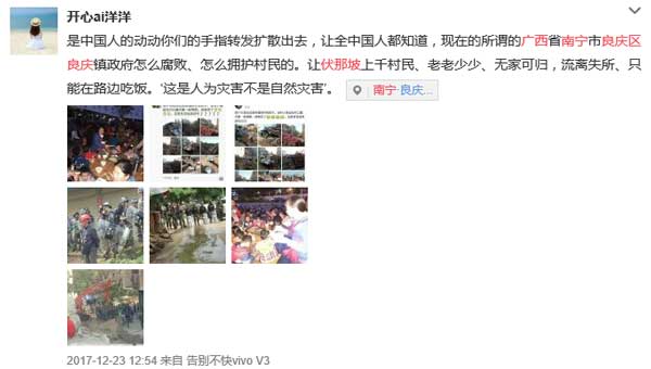 网友@开心ai洋洋:中国人的动动你们的手指转发扩散出去,让全中国人都知道,现在的所谓的广西省南宁市良庆区良庆镇政府怎么腐败、怎么拥护村民的。让伏那坡上千村民、老老少少、无家可归,流离失所、只能在路边吃饭。‘这是人为灾害不是自然灾害’。