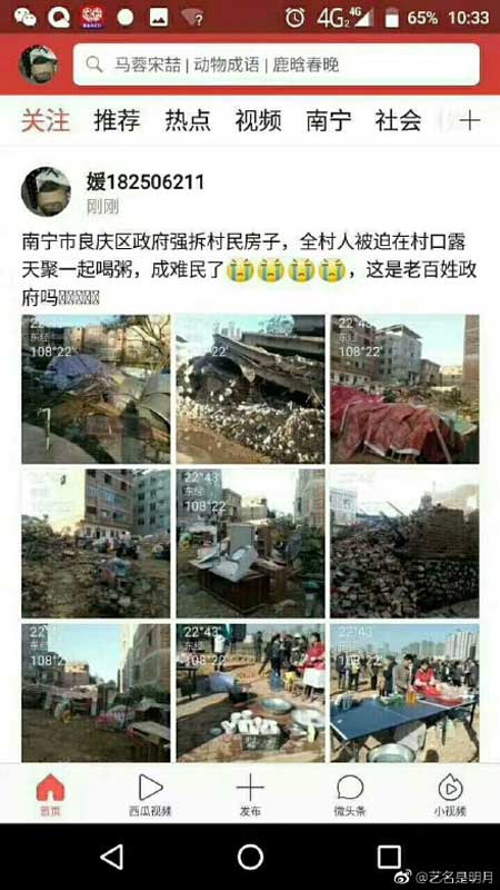 网友@不离不弃6438793544:别以为山高皇帝远政府做那些丧尽天良的事,广西省南宁市良庆区良庆镇强拆迁无补偿政府怎么腐败、让伏那坡上千村民、老老少少、无家可归,流离失所、只能在路边吃饭。现在也下雨让他们什么过,谁来帮我们度过这个冬季!!