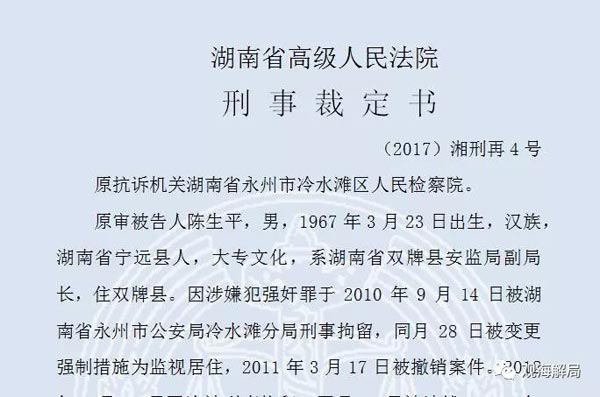 2017年11月14日,湖南高院作出终审裁定:双牌县安监局原副局长陈生平,强奸其妻妹罗某(未遂),但因患精神分裂症,故免予刑事处罚。