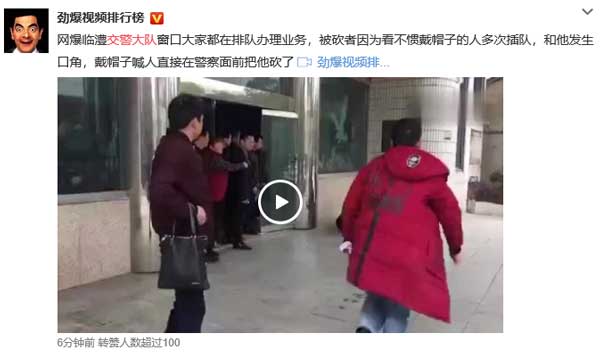 今日,据新浪网友@劲爆视频排行榜发博文称:网爆临澧交警大队窗口大家都在排队办理业务,被砍者因为看不惯戴帽子的人多次插队,和他发生口角,戴帽子喊人直接在警察面前把他砍了