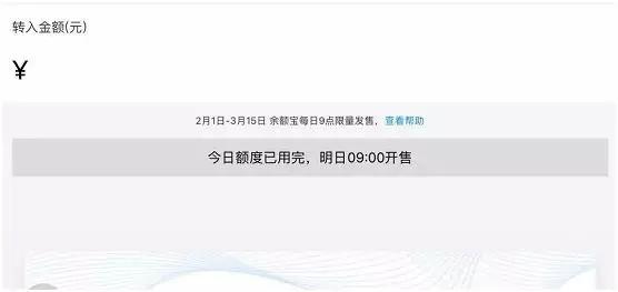 今年1月再次加码,规定2月1日起至3月15日,购买余额宝有总量限制,也就说,九点开售,今天的量买完了,你就只能等第二天抢购。