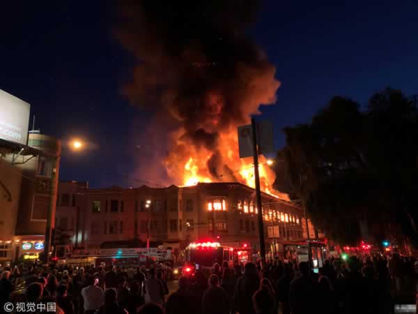 当地时间2018年3月17日,美国旧金山,当地一栋建筑物发生火灾,现场浓烟滚滚。