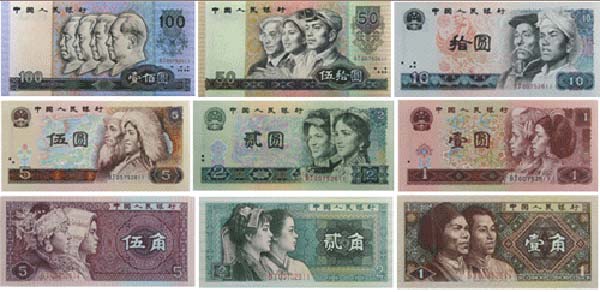(六)第四套人民币1元纸币。其主色调为深红,正面图案为瑶族、侗族人物头像,背面图案为长城。