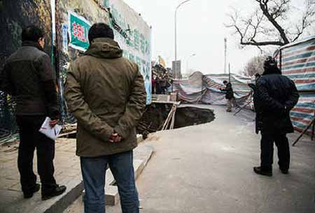 市民:一片废墟,还有就是工人在这修复,具体看不清,坑看不清就有土,隐隐约约有塌陷的地方。