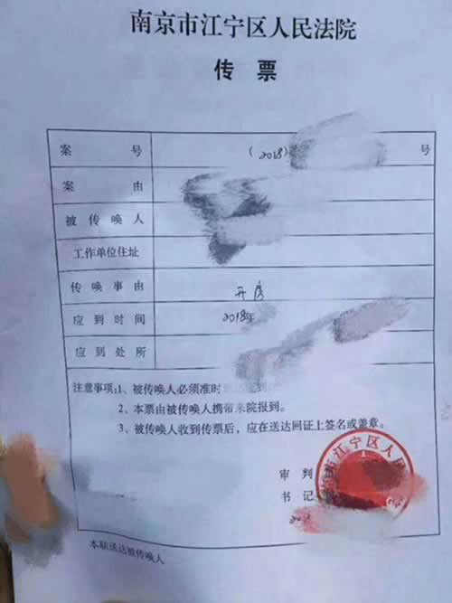 2018年4月2日22时许,有认证微博发布一张南京市江宁区人民法院传票照片的信息。该传票上“传唤事由”栏显示为手工填写的“开房”字样,引起网民围观并提出质疑。
