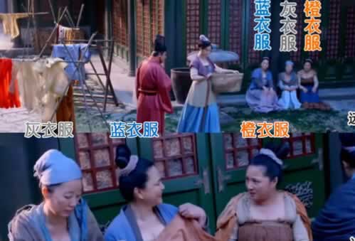 《武媚娘》5大穿帮镜头第五穿帮镜头:武如意被贬到掖庭洗衣房时,旁边地上坐着的三个女人,其顺序依次为:蓝衣服-灰衣服-橙衣服。拍这三个人特写镜头时,顺序则变成了:灰衣服-蓝衣服
