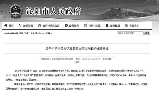沁阳市委宣传部相关负责人证实,15日上午9时20分,薛勇带领相关人员,赴神农山景区检查督导全域旅游发展,现场办公研究景区完善提升工作。在中午12时10分时,在景点“龙脊长城”拟整修提升路段附近,坐在步道旁一块石头上听取汇报,现场研究解决具体问题,时间长达40余分钟,当中午1时左右起身离开时,不慎失足坠落悬崖,因公殉职。