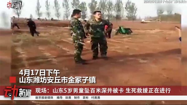 4月17日16时许,山东一名5岁男童坠入一口岩芯井。据悉,男童卡在距离井口约6米位置。深井口径约20公分 估计深100米。救援队出动近10辆挖掘机紧急施救,消防官兵从井东侧深挖,在男童被卡位置之下打孔施救。据介绍,事发时,男童母亲正在地里挖野菜。