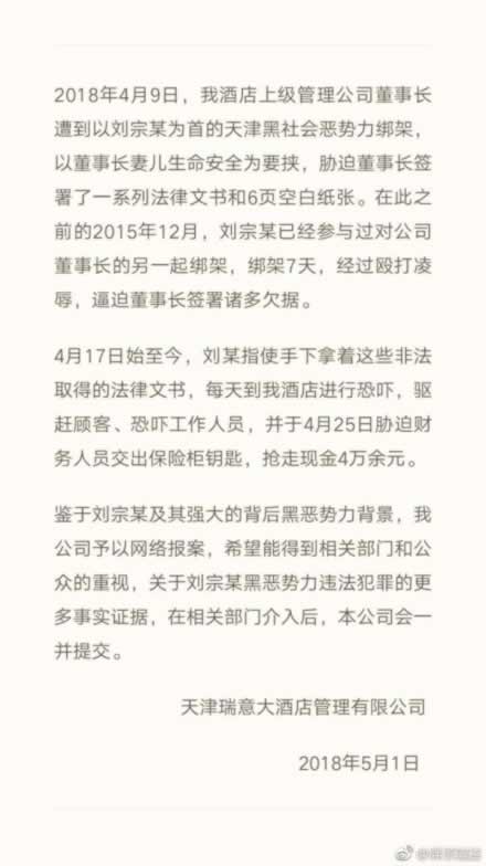 5月1日认证为“瑞意酒店”的微博账号发消息称,其酒店上级管理公司董事长遭到以刘宗某的不明势力的绑架,在胁迫状态下签署了诸多欠据,瑞意酒店还被多次恐吓,4万元现金被劫走。5月3日,天津警方通报了这起网络举报。警方称,问题涉及经济纠纷。