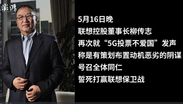 5月16日晚,联想控股董事长柳传志再次就“5G方案投票不爱国”发声,称有人把卖国贼的帽子扣在联想集团的头上,不但是要砸全体联想人的饭碗,还要联想终身蒙羞受辱。