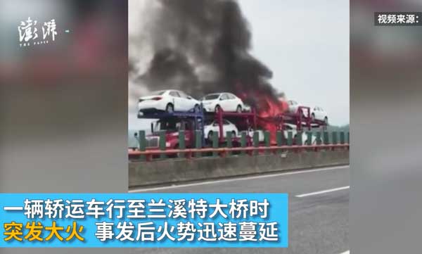5月26日,湖北黄冈,一辆由广东开往北京的轿运车行驶至浠水县兰溪特大桥上时突发大火并迅速蔓延,约半小时后轿运货车及其运载的9辆轿车全被烧成空壳。