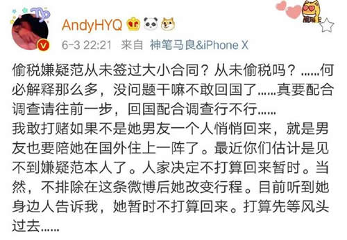 素有娱乐圈纪检委称号的黄毅清此消息出来当天晚上,发文称范冰冰已经斥资2亿在上海买房,准备过继到亲戚名下。称范冰冰秘密给其母亲打钱5亿。