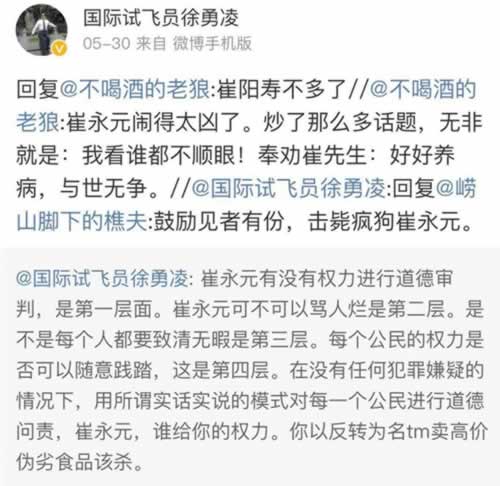 6月3日,实名认证微博“国际试飞员徐勇凌”在微博上发言称崔永元“阳寿不多了”,并且@崔永元称其“跟我斗,黑道白道都不是个”。随后,徐勇凌删除了微博内容。