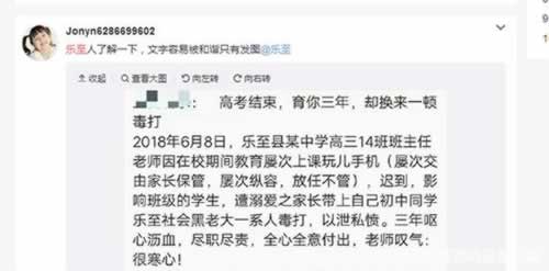 8日,有网贴称,因在校期间管教了上课耍手机、在校谈恋爱的违纪学生,四川资阳市乐至中学一名班主任在高考结束当晚,接到同是教师的学生家长邀约后,被学生家长带来的人暴打。